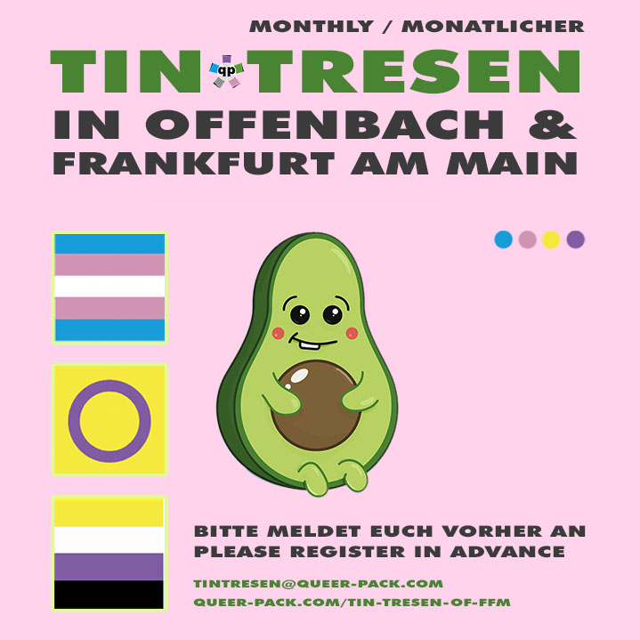 Please register by Friday, April 3, if you’d like to attend. Simply send us an email with your first name to tintresen@queer-pack.com. We’ll email you the location a few days before the meeting and are really looking forward to meeting you. Our meetings always take place at 7 pm.